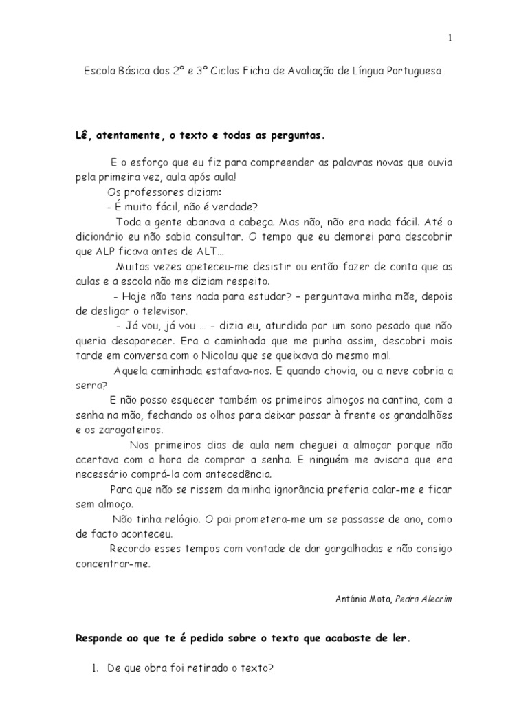 Escola Bsica dos 2 e 3 Ciclos Ficha de Avaliao de Lngua Portuguesa