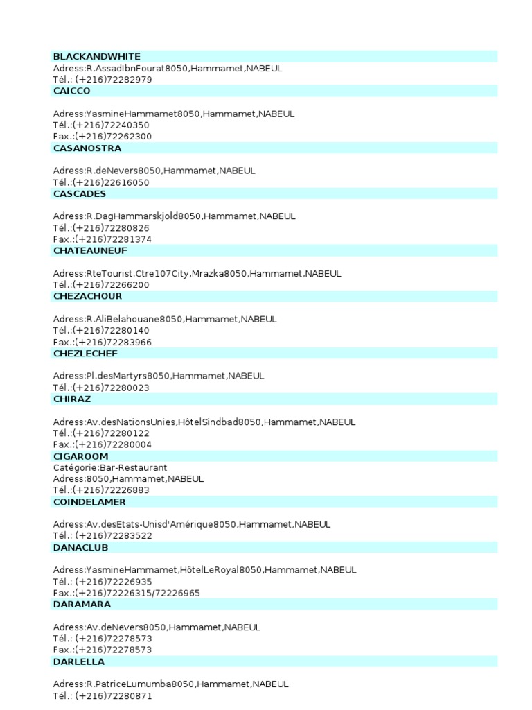 BLACKANDWHITE Adress:R.AssadIbnFourat8050,Hammamet,NABEUL Tl.: (+216)72282979 CAICCO Adress:YasmineHammamet8050,Hammamet,NABEUL Tl.:(+216)72240350 Fax.:(+216)72262300 CASANOSTRA Adress:R.deNevers8050,Hammamet,NABEUL Tl.:(+216)22616050 CASCADES Adress:R.DagHammarskjold8050,Hammamet,NABEUL Tl.:(+216)72280826 Fax.