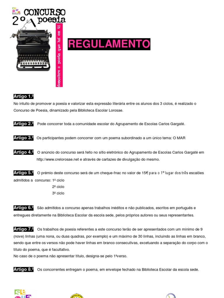 Artigo 2. Pode concorrer toda a comunidade escolar do Agrupamento de Escolas Carlos Gargat. Artigo 3. Os participantes podem concorrer com um poema subordinado a um nico tema: O MAR Artigo 4. O anncio do concurso ser feito no stio eletrnico do Agrupamento de Escolas Carlos Gargat em
