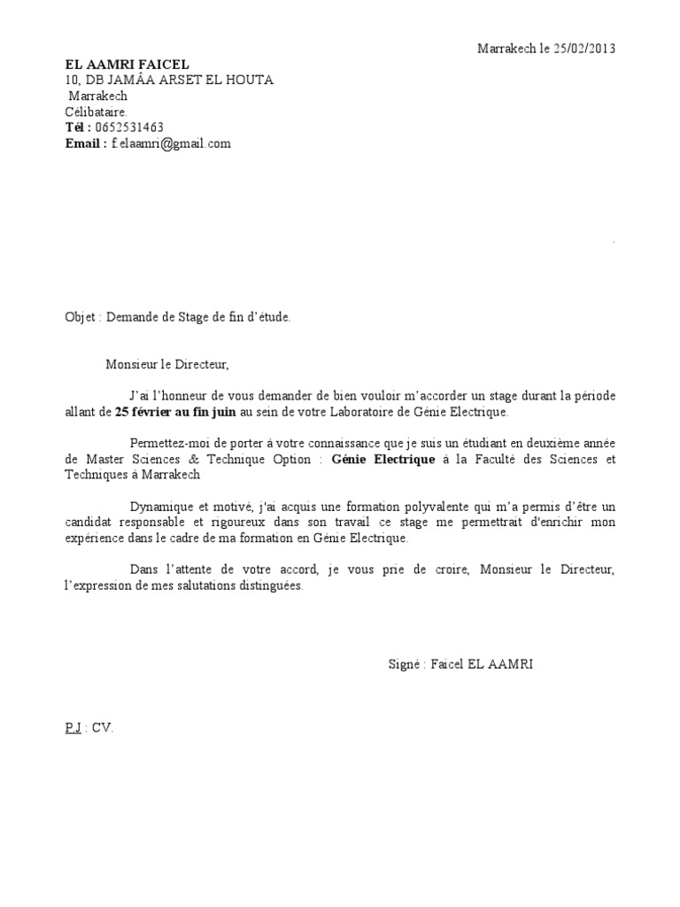 Objet : Demande de Stage de fin dtude. Monsieur le Directeur, Jai lhonneur de vous demander de bien vouloir maccorder un stage durant la priode allant de 25 fvrier au fin juin au sein de votre Laboratoire de Gnie Electrique. Permettez-moi de porter votre connaissance que je suis un tudiant en deuxime anne de Master Sciences & Technique Option : Gnie Electrique la Facult des Sciences et Techniques Marrakech Dynamique et motiv, j'ai acquis une formation polyvalente qui ma permis dtre un candidat responsable et rigoureux dans son travail ce stage me permettrait d'enrichir mon exprience dans le cadre de ma formation en Gnie Electrique. Dans lattente de votre accord, je vous prie de croire, Monsieur le Directeur, lexpression de mes salutations distingues.