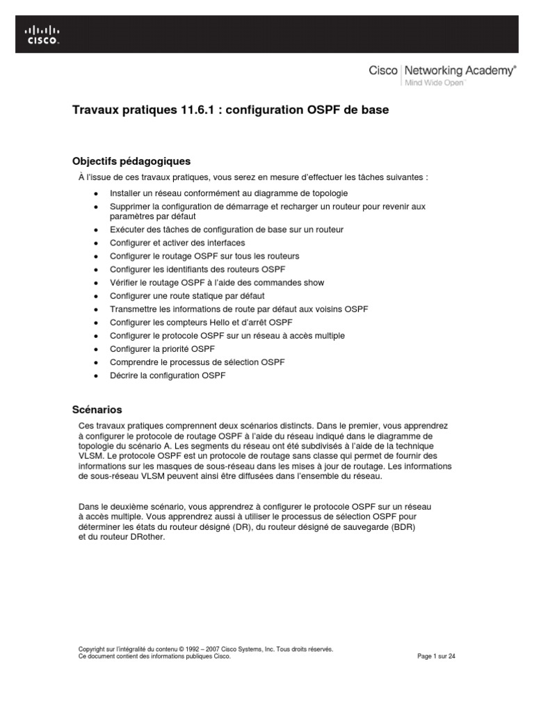 lissue de ces travaux pratiques, vous serez en mesure deffectuer les tches suivantes : Installer un rseau conformment au diagramme de topologie Supprimer la configuration de dmarrage et recharger un routeur pour revenir aux paramtres par dfaut Excuter des tches de configuration de base sur un routeur Configurer et activer des interfaces Configurer le routage OSPF sur tous les routeurs Configurer les identifiants des routeurs OSPF Vrifier le routage OSPF laide des commandes show Configurer une route statique par dfaut Transmettre les informations de route par dfaut aux voisins OSPF Configurer les compteurs Hello et darrt OSPF Configurer le protocole OSPF sur un rseau accs multiple Configurer la priorit OSPF Comprendre le processus de slection OSPF Dcrire la configuration OSPF