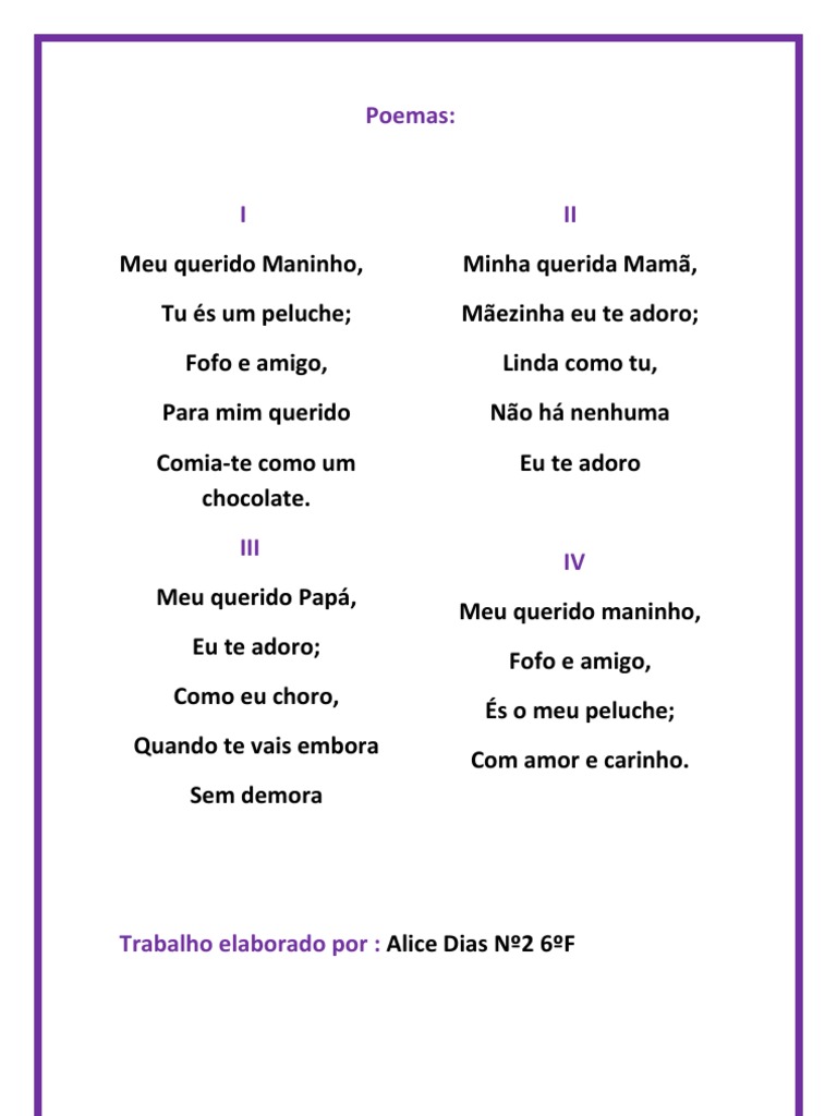I Meu querido Maninho, Tu s um peluche; Fofo e amigo, Para mim querido Comia-te como um chocolate. III Meu querido Pap, Eu te adoro; Como eu choro, Quando te vais embora Sem demora