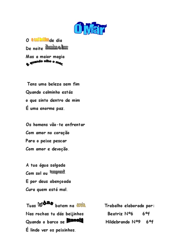 Tens uma beleza sem fim Quando calminho ests o que sinto dentro de mim uma enorme paz. Os homens vo-te enfrentar Com amor no corao Para o peixe pescar Com amor e devoo. A tua gua salgada Com sol ou E por deus abenoada Cura quem est mal. Tuas batem na Trabalho elaborado por: Beatriz N6 Hildebrando N9 6f 6f