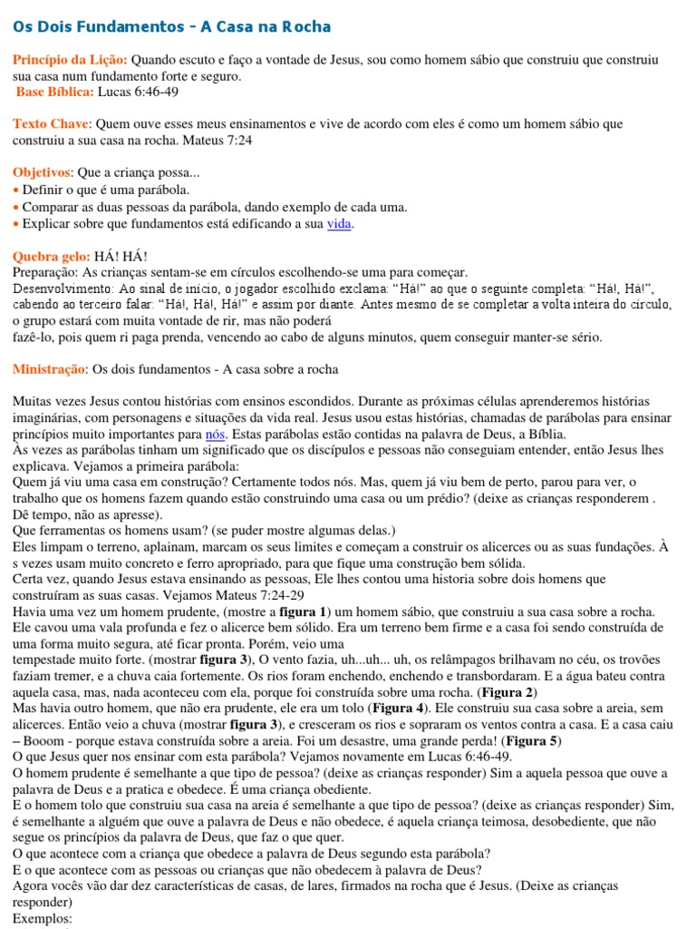 O que Jesus quer nos ensinar com esta parábola? Vejamos novamente em Lucas 6:46-49. O homem prudente é semelhante a que tipo de pessoa? (deixe as crianças responder) Sim a aquela pessoa que ouve a palavra de Deus e a pratica e obedece. É uma criança obediente. E o homem tolo que construiu sua casa na areia é semelhante a que tipo de pessoa? (deixe as crianças responder) Sim, é semelhante a alguém que ouve a palavra de Deus e não obedece, é aquela criança teimosa, desobediente, que não segue os princípios da palavra de Deus, que faz o que quer. O que acontece com a criança que obedece a palavra de Deus segundo esta parábola? E o que acontece com as pessoas ou crianças que não obedecem à palavra de Deus? Agora vocês vão dar dez características de casas, de lares, firmados na rocha que é Jesus. (Deixe as crianças responder) Exemplos:
