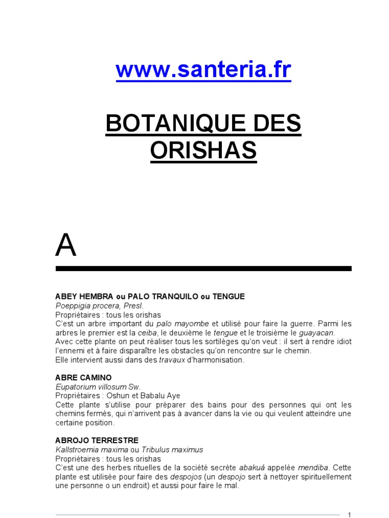 AJONJOLI Sesamum indicum L. Propritaire : Babalu Aye Il est tabou dans les maisons de cet orisha. Si un fils de saint Lazare (Babalu Aye) mange de lajonjoli, il peut en mourir. Il loigne le mal mlang avec lcorce de corojo, azogue et pimienta de Guinea. Cependant il peut tre utilis pour faire le mal car Babalu Aye bilonga (fait de la sorcellerie) avec cette plante. ALACRANCILLO Heliotropium indicum L. Propritaire : Obatala mais aussi attribue Oshun, Oggun, Oshosi, Osun Pour prparer des bains lustrales qui attirent la prosprit et lamour. ALAMO Ficus religiosa L. Propritaire : Shango, Aa, Oggun, Cest lun des arbres les plus importants consacrs Shango. Il est utilis pour prparer lomiero du asiento (crmonie dinitiation) et laver les attributs de lorisha. Quand Shango est en colre, on le calme avec des feuilles dalamo (peuplier), rompezaraguey et culantrillo. Le rceptacle o lon garde les otas (pierres) de Shango, appel batea, est fait en bois de cdre peint en rouge et blanc, et recouvert des feuilles dalamo, quon utilise aussi pour orner les autels et le trne de ses initis. Shango aime bien manger dans lalamo et recevoir les offrandes habituelles, attaches avec des rubans rouges. Pour loigner les mauvais esprits dune maison on fait des baldeos avec ses feuilles. Rduit en poudre et mlang avec de la banane et avec les prires adquates, il est prpar pour faire le bien ou le mal. Pour dtruire un mauvais sort ou un envotement, on mlange les feuilles dalamo avec salvadera, hierbabuena, prodigiosa, abrecamino et alcanfor. Avec tout cela on nettoie la maison laide dune serpillre. En palo mayombe, on nutilise pas lalamo. Les fils et protgs de Shango prennent des bains avec une dcoction de feuilles dalamo pour se purifier. Les frictions avec la sve de cet arbre loignent les mauvaises influences. ALBAHACA ou ALBAHACA MONDONGUERA Ocimum basilicum L. Propritaires : Oshun, Yemaya et Babalu Aye Utilise pour des bains lustrales qui attirent la bonne chance. Aussi pour despojar ou loigner les mauvaises influences et le mauvais sort. Lencens brl avec cette plante loigne les mauvais esprits. Pour attirer les bonnes influences dans une maison, prendre trois bains de albahaca (basilic) de toutes les varits, avec des azucenas (fleur de lys) et des roses blanches. Les diffrentes albahacas restent pendant sept jours dans un endroit o personne napproche. Pendant cinq soirs conscutifs on mettra sous la tte du lit, le