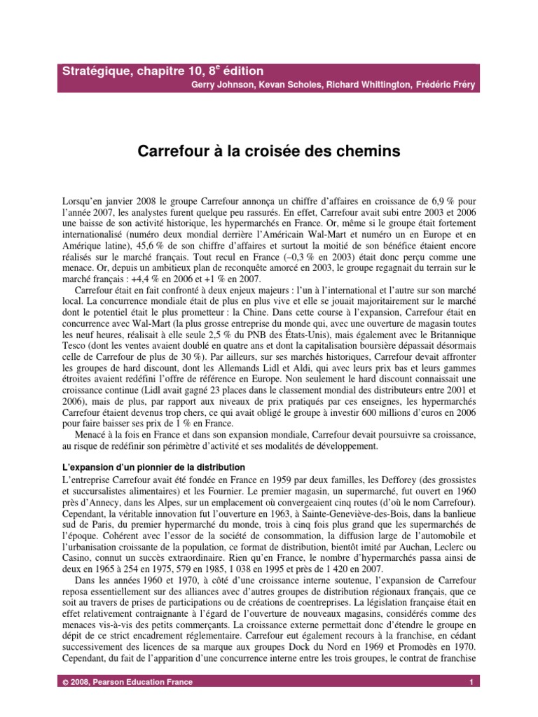 Lorsquen janvier 2008 le groupe Carrefour annona un chiffre daffaires en croissance de 6,9 % pour lanne 2007, les analystes furent quelque peu rassurs. En effet, Carrefour avait subi entre 2003 et 2006 une baisse de son activit historique, les hypermarchs en France. Or, mme si le groupe tait fortement internationalis (numro deux mondial derrire lAmricain Wal-Mart et numro un en Europe et en Amrique latine), 45,6 % de son chiffre daffaires et surtout la moiti de son bnfice taient encore raliss sur le march franais. Tout recul en France (0,3 % en 2003) tait donc peru comme une menace. Or, depuis un ambitieux plan de reconqute amorc en 2003, le groupe regagnait du terrain sur le march franais : +4,4 % en 2006 et +1 % en 2007. Carrefour tait en fait confront deux enjeux majeurs : lun linternational et lautre sur son march local. La concurrence mondiale tait de plus en plus vive et elle se jouait majoritairement sur le march dont le potentiel tait le plus prometteur : la Chine. Dans cette course lexpansion, Carrefour tait en concurrence avec Wal-Mart (la plus grosse entreprise du monde qui, avec une ouverture de magasin toutes les neuf heures, ralisait elle seule 2,5 % du PNB des tats-Unis), mais galement avec le Britannique Tesco (dont les ventes avaient doubl en quatre ans et dont la capitalisation boursire dpassait dsormais celle de Carrefour de plus de 30 %). Par ailleurs, sur ses marchs historiques, Carrefour devait affronter les groupes de hard discount, dont les Allemands Lidl et Aldi, qui avec leurs prix bas et leurs gammes troites avaient redfini loffre de rfrence en Europe. Non seulement le hard discount connaissait une croissance continue (Lidl avait gagn 23 places dans le classement mondial des distributeurs entre 2001 et 2006), mais de plus, par rapport aux niveaux de prix pratiqus par ces enseignes, les hypermarchs Carrefour taient devenus trop chers, ce qui avait oblig le groupe investir 600 millions deuros en 2006 pour faire baisser ses prix de 1 % en France. Menac la fois en France et dans son expansion mondiale, Carrefour devait poursuivre sa croissance, au risque de redfinir son primtre dactivit et ses modalits de dveloppement.