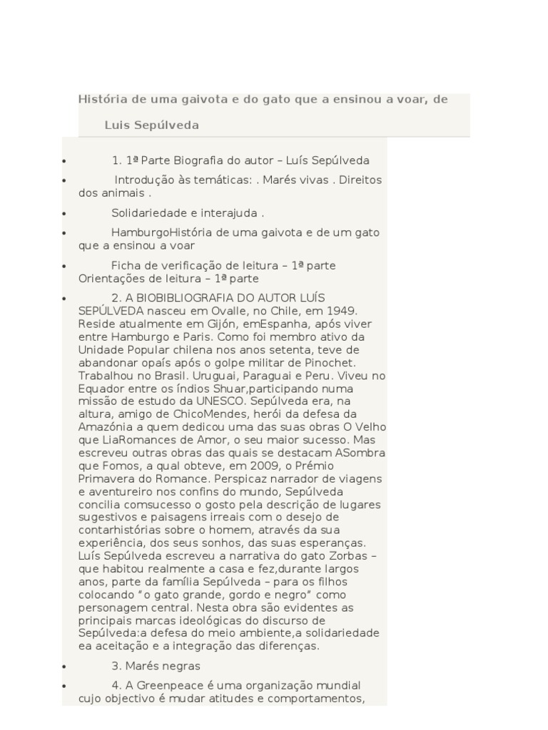 1. 1 Parte Biografia do autor Lus Seplveda Introduo s temticas: . Mars vivas . Direitos dos animais . Solidariedade e interajuda . HamburgoHistria de uma gaivota e de um gato que a ensinou a voar Ficha de verificao de leitura 1 parte Orientaes de leitura 1 parte 2. A BIOBIBLIOGRAFIA DO AUTOR LUS SEPLVEDA nasceu em Ovalle, no Chile, em 1949. Reside atualmente em Gijn, emEspanha, aps viver entre Hamburgo e Paris. Como foi membro ativo da Unidade Popular chilena nos anos setenta, teve de abandonar opas aps o golpe militar de Pinochet. Trabalhou no Brasil. Uruguai, Paraguai e Peru. Viveu no Equador entre os ndios Shuar,participando numa misso de estudo da UNESCO. Seplveda era, na altura, amigo de ChicoMendes, heri da defesa da Amaznia a quem dedicou uma das suas obras O Velho que LiaRomances de Amor, o seu maior sucesso. Mas escreveu outras obras das quais se destacam ASombra que Fomos, a qual obteve, em 2009, o Prmio Primavera do Romance. Perspicaz narrador de viagens e aventureiro nos confins do mundo, Seplveda concilia comsucesso o gosto pela descrio de lugares sugestivos e paisagens irreais com o desejo de contarhistrias sobre o homem, atravs da sua experincia, dos seus sonhos, das suas esperanas. Lus Seplveda escreveu a narrativa do gato Zorbas que habitou realmente a casa e fez,durante largos anos, parte da famlia Seplveda para os filhos colocando o gato grande, gordo e negro como personagem central. Nesta obra so evidentes as principais marcas ideolgicas do discurso de Seplveda:a defesa do meio ambiente,a solidariedade ea aceitao e a integrao das diferenas. 3. Mars negras 4. A Greenpeace uma organizao mundial cujo objectivo mudar atitudes e comportamentos,