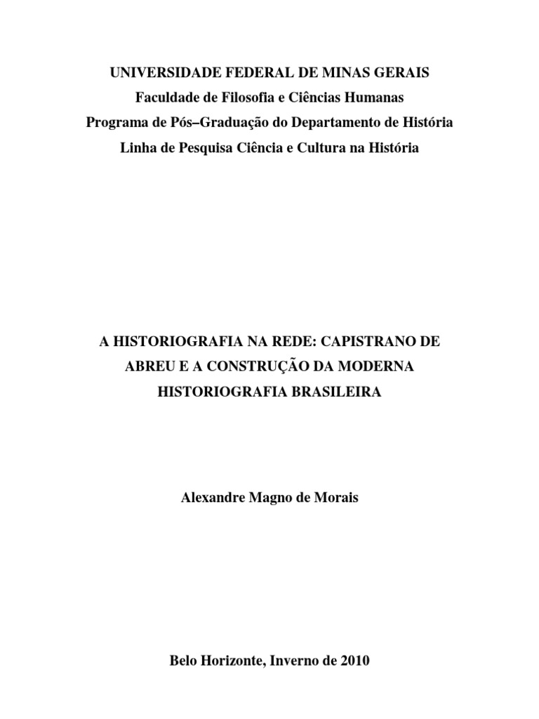 Morais, Alexandre Magno de. A historiografia na rede: Capistrano de Abreu e a construo da moderna historiografia brasileira / Alexandre Magno de Morais. Belo Horizonte: UFMG / Faculdade de Filosofia e Cincias Humanas, 2010. 196 p.; 31 cm. Orientador: Jos Carlos Reis Dissertao (mestrado) UFMG / Departamento de Histria / FAFICH, Referncias bibliogrficas: f. 192-198 1. Capistrano de Abreu. 2. Historiografia. 3. Redes. 4. Lugar de Histria. - Dissertao. I. Reis, Jos Carlos. II. Universidade Federal de Minas Gerais, Faculdade de Filosofia e Cincias Humanas, Departamento de Histria. III. Ttulo.