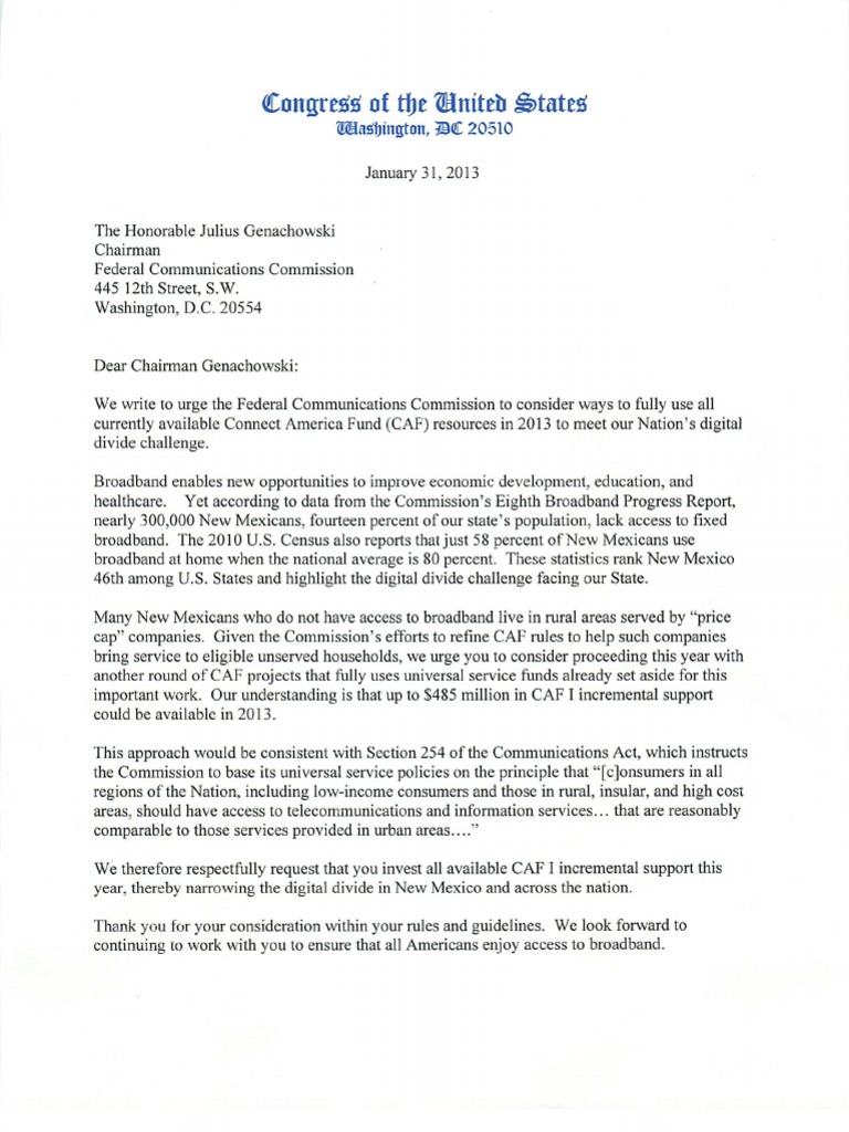 In January 2013, U.S. Senator Tom Udall and members of the NM delegation sent a letter to FCC Chairman Genachowski urging the FCC to use all available Connect America Fund resoures towards e…Description complète
