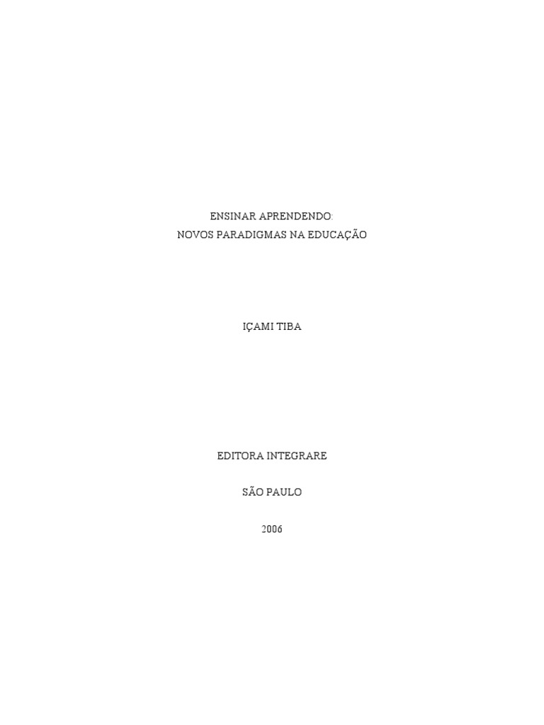 AGRADECIMENTOS E DEDICATRIA No existe algum que nunca teve um professor na vida, assim como no h ningum que nunca tenha tido um aluno. Se existem analfabetos, provavelmente no por vontade dos professores. Se existem letrados, porque um dia tiveram seus professores. Se existe Prmio Nobel, porque alunos superaram seus professores. Se existem grandes sbios, porque transcenderam suas funes de professores. Quanto mais se aprende, mais se quer ensinar. Quanto mais se ensina, mais se quer aprender. Iami Tiba Agradeo a todos os professores a quem a humanidade entregou seus amados filhos. Dedico este livro a todos os professores que batalham por uma Educao Integral, tornando este mundo cada vez melhor.