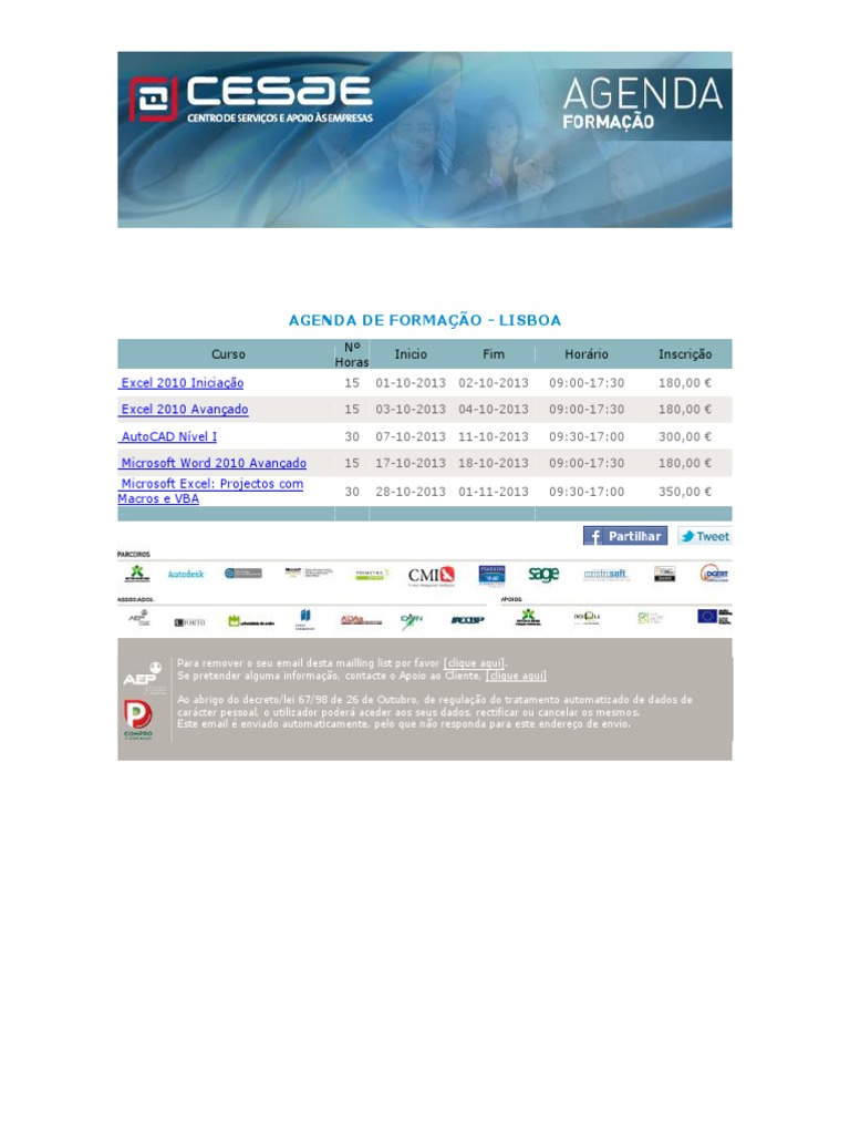 Curso Excel 2010 Iniciao Excel 2010 Avanado AutoCAD Nvel I Microsoft Word 2010 Avanado Microsoft Excel: Projectos com Macros e VBA N Horas 15 15 30 15 30 Inicio 01-10-2013 03-10-2013 07-10-2013 17-10-2013 28-10-2013 Fim 02-10-2013 04-10-2013 11-10-2013 18-10-2013 01-11-2013 Horrio 09:00-17:30 09:00-17:30 09:30-17:00 09:00-17:30 09:30-17:00 Inscrio 180,00 180,00 300,00 180,00 350,00