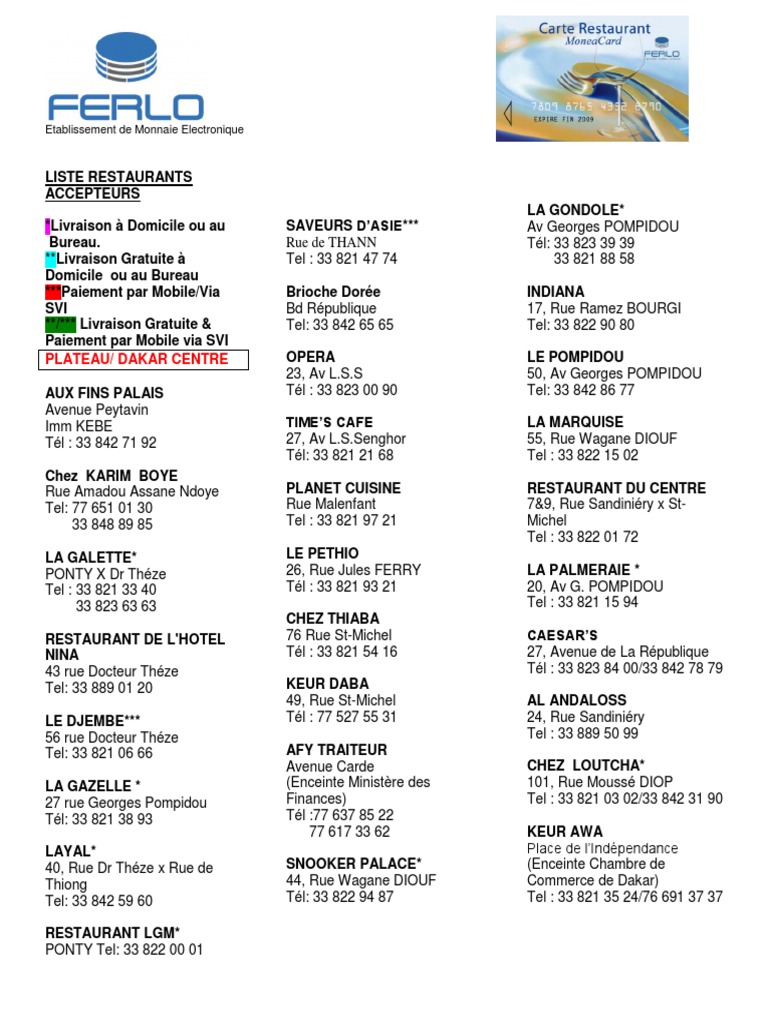 LISTE RESTAURANTS ACCEPTEURS *Livraison Domicile ou au Bureau. **Livraison Gratuite Domicile ou au Bureau ***Paiement par Mobile/Via SVI **/*** Livraison Gratuite & Paiement par Mobile via SVI PLATEAU/ DAKAR CENTRE AUX FINS PALAIS Avenue Peytavin Imm KEBE Tl : 33 842 71 92 Chez KARIM BOYE Rue Amadou Assane Ndoye Tel: 77 651 01 30 33 848 89 85 LA GALETTE* PONTY X Dr Thze Tel : 33 821 33 40 33 823 63 63 RESTAURANT DE L'HOTEL NINA 43 rue Docteur Thze Tel: 33 889 01 20 LE DJEMBE*** 56 rue Docteur Thze Tel: 33 821 06 66 LA GAZELLE * 27 rue Georges Pompidou Tl: 33 821 38 93 LAYAL* 40, Rue Dr Thze x Rue de Thiong Tel: 33 842 59 60 RESTAURANT LGM* PONTY Tel: 33 822 00 01 SAVEURS DASIE*** Rue de THANN Tel : 33 821 47 74 Brioche Dore Bd Rpublique Tel: 33 842 65 65 OPERA 23, Av L.S.S Tl : 33 823 00 90 TIMES CAFE 27, Av [Link] Tl: 33 821 21 68 PLANET CUISINE Rue Malenfant Tel : 33 821 97 21 LE PETHIO 26, Rue Jules FERRY Tl : 33 821 93 21 CHEZ THIABA 76 Rue St-Michel Tl : 33 821 54 16 KEUR DABA 49, Rue St-Michel Tl : 77 527 55 31 AFY TRAITEUR Avenue Carde (Enceinte Ministre des Finances) Tl :77 637 85 22 77 617 33 62 SNOOKER PALACE* 44, Rue Wagane DIOUF Tl: 33 822 94 87 LA GONDOLE* Av Georges POMPIDOU Tl: 33 823 39 39 33 821 88 58 INDIANA 17, Rue Ramez BOURGI Tel: 33 822 90 80 LE POMPIDOU 50, Av Georges POMPIDOU Tel: 33 842 86 77 LA MARQUISE 55, Rue Wagane DIOUF Tel : 33 822 15 02 RESTAURANT DU CENTRE 7&9, Rue Sandiniry x StMichel Tel : 33 822 01 72 LA PALMERAIE * 20, Av G. POMPIDOU Tel : 33 821 15 94 CAESARS 27, Avenue de La Rpublique Tl : 33 823 84 00/33 842 78 79 AL ANDALOSS 24, Rue Sandiniry Tel : 33 889 50 99 CHEZ LOUTCHA* 101, Rue Mouss DIOP Tel : 33 821 03 02/33 842 31 90 KEUR AWA Place de lIndpendance (Enceinte Chambre de Commerce de Dakar) Tel : 33 821 35 24/76 691 37 37