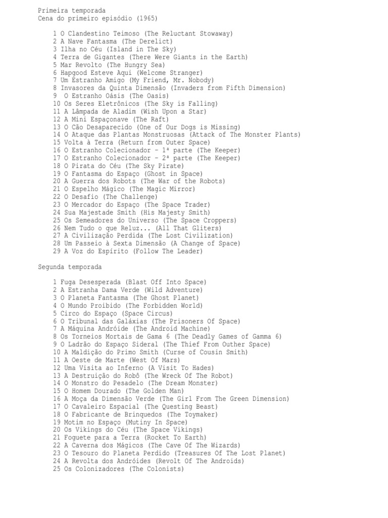 3 Ilha no Cu (Island in The Sky) 4 Terra de Gigantes (There Were Giants in the Earth) 5 Mar Revolto (The Hungry Sea) 6 Hapgood Esteve Aqui (Welcome Stranger) 7 Um Estranho Amigo (My Friend, Mr. Nobody) 8 Invasores da Quinta Dimenso (Invaders from Fifth Dimension) 9 O Estranho Osis (The Oasis) 10 Os Seres Eletrnicos (The Sky is Falling) 11 A Lmpada de Aladim (Wish Upon a Star) 12 A Mini Espaonave (The Raft) 13 O Co Desaparecido (One of Our Dogs is Missing) 14 O Ataque das Plantas Monstruosas (Attack of The Monster Plants) 15 Volta Terra (Return from Outer Space) 16 O Estranho Colecionador - 1 parte (The Keeper) 17 O Estranho Colecionador - 2 parte (The Keeper) 18 O Pirata do Cu (The Sky Pirate) 19 O Fantasma do Espao (Ghost in Space) 20 A Guerra dos Robots (The War of the Robots) 21 O Espelho Mgico (The Magic Mirror) 22 O Desafio (The Challenge) 23 O Mercador do Espao (The Space Trader) 24 Sua Majestade Smith (His Majesty Smith) 25 Os Semeadores do Universo (The Space Croppers) 26 Nem Tudo o que Reluz... (All That Gliters) 27 A Civilizao Perdida (The Lost Civilization) 28 Um Passeio Sexta Dimenso (A Change of Space) 29 A Voz do Esprito (Follow The Leader) Segunda temporada 1 Fuga Desesperada (Blast Off Into Space) 2 A Estranha Dama Verde (Wild Adventure) 3 O Planeta Fantasma (The Ghost Planet) 4 O Mundo Proibido (The Forbidden World) 5 Circo do Espao (Space Circus) 6 O Tribunal das Galxias (The Prisoners Of Space) 7 A Mquina Andride (The Android Machine) 8 Os Torneios Mortais de Gama 6 (The Deadly Games of Gamma 6) 9 O Ladro do Espao Sideral (The Thief From Outher Space) 10 A Maldio do Primo Smith (Curse of Cousin Smith) 11 A Oeste de Marte (West Of Mars) 12 Uma Visita ao Inferno (A Visit To Hades) 13 A Destruio do Rob (The Wreck Of The Robot) 14 O Monstro do Pesadelo (The Dream Monster) 15 O Homem Dourado (The Golden Man) 16 A Moa da Dimenso Verde (The Girl From The Green Dimension) 17 O Cavaleiro Espacial (The Questing Beast) 18 O Fabricante de Brinquedos (The Toymaker) 19 Motim no Espao (Mutiny In Space) 20 Os Vikings do Cu (The Space Vikings) 21 Foguete para a Terra (Rocket To Earth) 22 A Caverna dos Mgicos (The Cave Of The Wizards) 23 O Tesouro do Planeta Perdido (Treasures Of The Lost Planet) 24 A Revolta dos Andrides (Revolt Of The Androids) 25 Os Colonizadores (The Colonists)