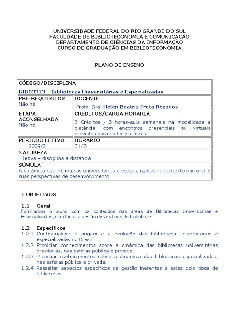 Familiarizar o aluno com os conteúdos das áreas de Bibliotecas Universitárias e