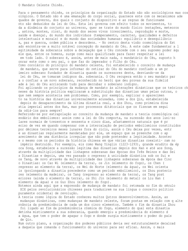 antigo cnon administrativo chins, o da administrao dos Zhou, prev que o governo deve ser organizado em seis departamentos, que se referem respectivamente ao Cu, Terr a e s quatro estaes e que os servios dependentes desses departamentos devem no total ser em nmero de trezentos e sessenta, idntico ao dos dias do ano. Claro que ao longo do tempo se esbateu o desenho primitivo de uma viso do mundo e streitamente tributria da cosmologia divinatria arcaica. A partir do sculo VII comea e ser posta em causa a explicao das mudanas dinsticas pela alternncia da predominncia de cada um dos cinco elementos. Mas toda uma simbologia da racionalidade csmica do poder de Estado no deixou de ser minuciosamente mantida pelo ritualismo. por i sso que, no Estado imperial, as execues capitais, por exemplo, no podiam ter lugar em princpio seno no Outono, estao do elemento do metal, sob a dependncia do qual esta va antigamente colocado o emprego das armas, tanto na execuo dos altos feitos como na guerra. Foi esta racionalidade csmica que impediu sempre imaginar uma outra forma de Esta do sem ser o Estado monrquico: da mesma maneira que existe um s Cu acima dos dez mi l seres do universo, tambm no poderia haver mais do que um imperador na terra inte ira, repetem saciedade os autores. Na generalidade, esta racionalidade csmica ocu ltou completamente a natureza do Estado, qualquer que fosse a sua forma, monrquic a ou outra, como organismo imanente na realidade do prprio corpo social. Miribel, J. e Vandermeersch, L. Sabedorias chinesas. Lisboa: Instituto Piaget, 2 004 p. 91-103