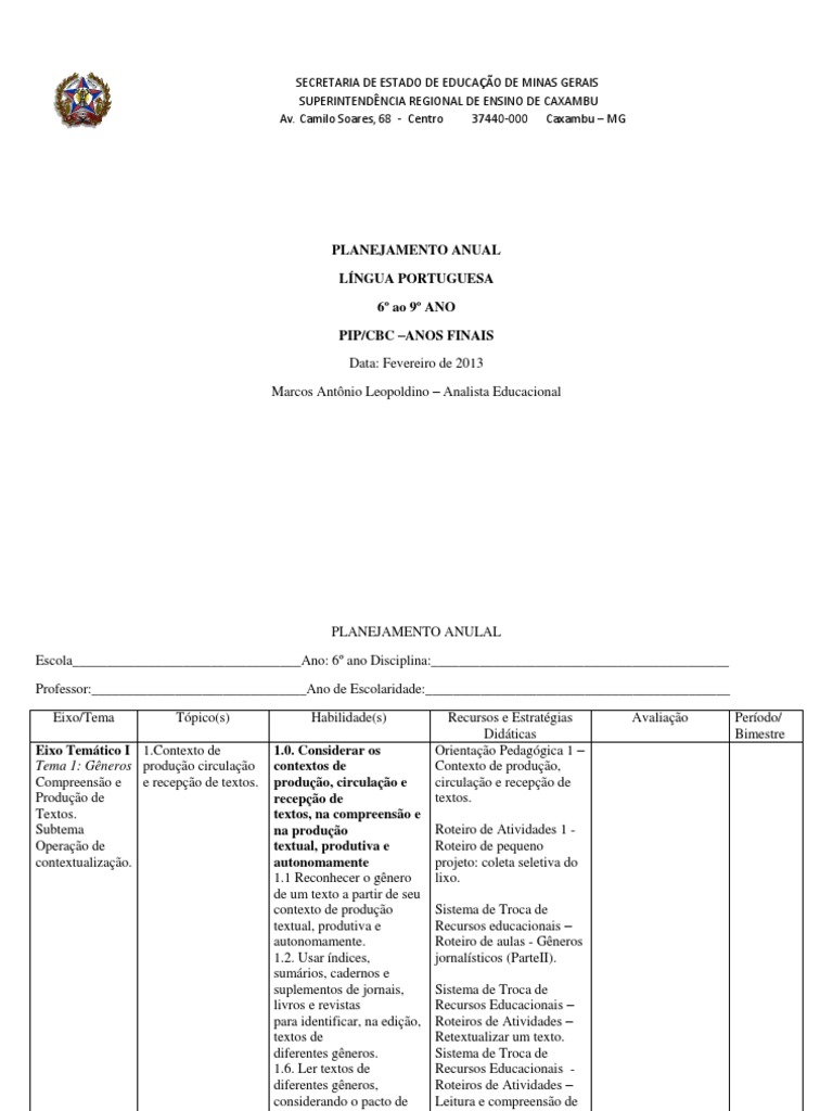 PLANEJAMENTO ANULAL Escola_________________________________Ano: 6 ano Disciplina:___________________________________________ Professor:_______________________________Ano de Escolaridade:____________________________________________ Eixo/Tema Tpico(s) Habilidade(s) 1.0. Considerar os contextos de produo, circulao e recepo de textos, na compreenso e na produo textual, produtiva e autonomamente 1.1 Reconhecer o gnero de um texto a partir de seu contexto de produo textual, produtiva e autonomamente. 1.2. Usar ndices, sumrios, cadernos e suplementos de jornais, livros e revistas para identificar, na edio, textos de diferentes gneros. 1.6. Ler textos de diferentes gneros, considerando o pacto de recepo desses textos. Recursos e Estratgias Didticas Orientao Pedaggica 1 Contexto de produo, circulao e recepo de textos. Roteiro de Atividades 1 Roteiro de pequeno projeto: coleta seletiva do lixo. Sistema de Troca de Recursos educacionais Roteiro de aulas - Gneros jornalsticos (ParteII). Sistema de Troca de Recursos Educacionais Roteiros de Atividades Retextualizar um texto. Sistema de Troca de Recursos Educacionais Roteiros de Atividades Leitura e compreenso de textos. Sistema de Troca de Avaliao Perodo/ Bimestre