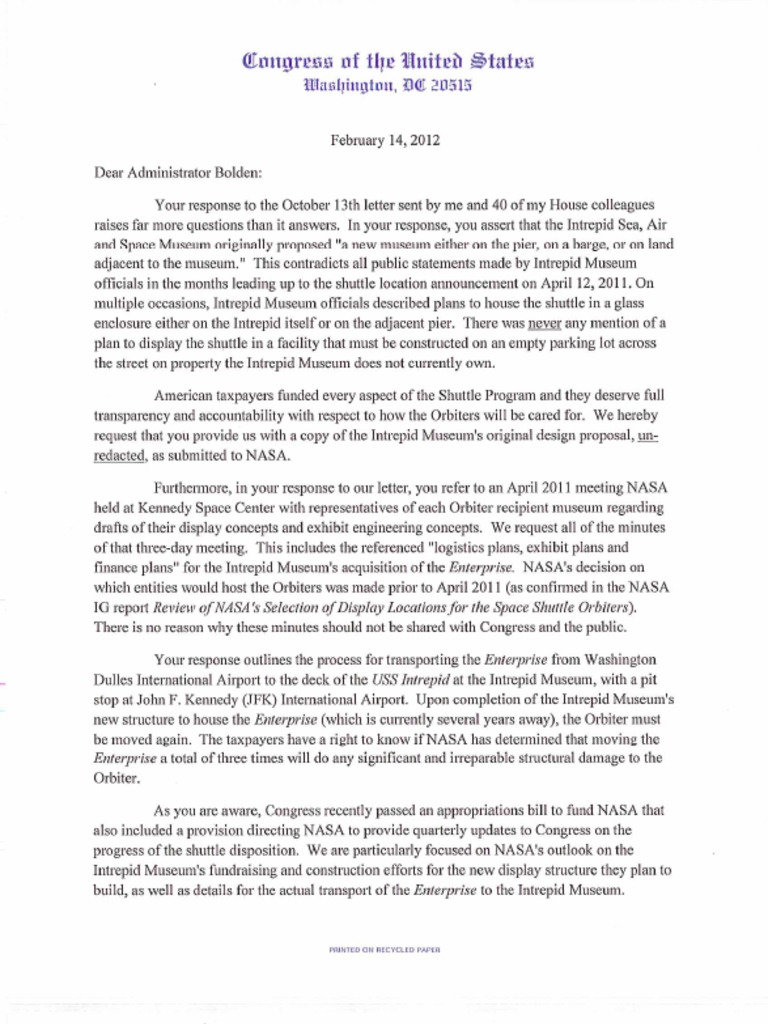 February 14, 2012: A follow up letter to the October 13, 2011 letter to Administrator Bolden regarding the fundraising and construction efforts regarding the housing of of the Enterprise at …Description complète