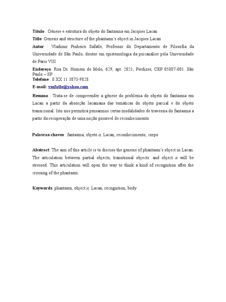 Título : Gênese e estrutura do objeto do fantasma em Jacques Lacan