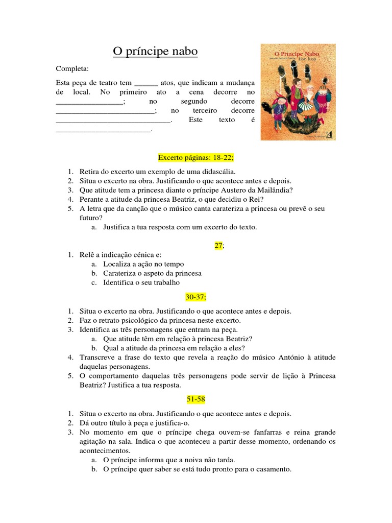 Excerto pginas: 18-22; 1. 2. 3. 4. 5. Retira do excerto um exemplo de uma didasclia. Situa o excerto na obra. Justificando o que acontece antes e depois. Que atitude tem a princesa diante o prncipe Austero da Mailndia? Perante a atitude da princesa Beatriz, o que decidiu o Rei? A letra que da cano que o msico canta carateriza a princesa ou prev o seu futuro? a. Justifica a tua resposta com um excerto do texto. 27; 1. Rel a indicao cnica e: a. Localiza a ao no tempo b. Carateriza o aspeto da princesa c. Identifica o seu trabalho 30-37; 1. Situa o excerto na obra. Justificando o que acontece antes e depois. 2. Faz o retrato psicolgico da princesa neste excerto. 3. Identifica as trs personagens que entram na pea. a. Que atitude tm em relao princesa Beatriz? b. Qual a atitude da princesa em relao a eles? 4. Transcreve a frase do texto que revela a reao do msico Antnio atitude daquelas personagens. 5. O comportamento daquelas trs personagens pode servir de lio Princesa Beatriz? Justifica a tua resposta. 51-58 1. Situa o excerto na obra. Justificando o que acontece antes e depois. 2. D outro ttulo pea e justifica-o. 3. No momento em que o prncipe chega ouvem-se fanfarras e reina grande agitao na sala. Indica o que aconteceu a partir desse momento, ordenando os acontecimentos. a. O prncipe informa que a noiva no tarda. b. O prncipe quer saber se est tudo pronto para o casamento.