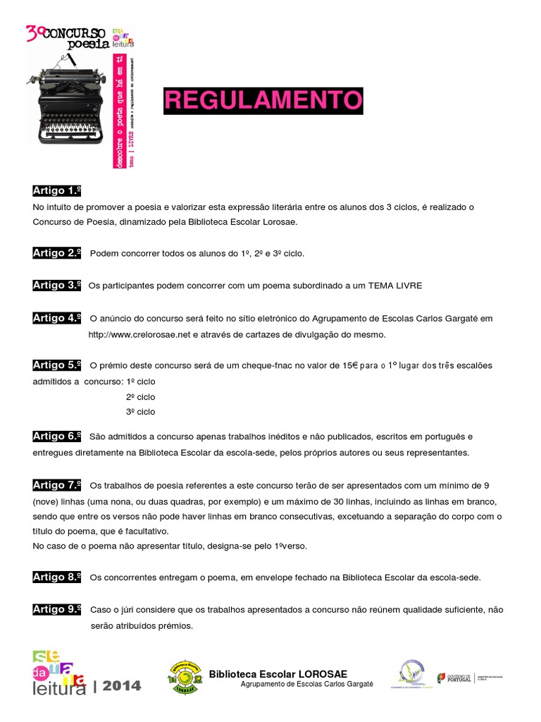 Artigo 2. Podem concorrer todos os alunos do 1, 2 e 3 ciclo. Artigo 3. Os participantes podem concorrer com um poema subordinado a um TEMA LIVRE Artigo 4. O anncio do concurso ser feito no stio eletrnico do Agrupamento de Escolas Carlos Gargat em