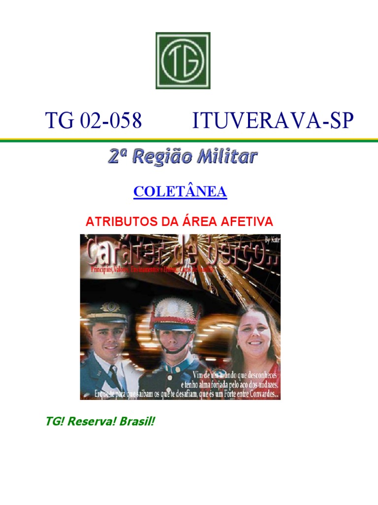 em função dos ideais e valores que defendem e representam.conduta que se caracteriza pelo respeito ao direito alheio. disciplinares e / ou judiciais. valores e requisitos da área afetiva. participação de grupos de debate. dependendo do propósito do usuário. avaliados. Devem servir. visando as providências que possibilitem o afastamento do instruendo. que devem dar o embasamento e a direção para o desenvolvimento. c. B/5-008(FC): Valorização do Serviço Militar: Reconhecimento da importância do serviço militar no desenvolvimento brasileiro. para uma ação imediata do docente que identifique sua ausência. participação de grupos de debate. possibilitando a sua correta utilização. palestras e no desenvolvimento de matérias que favoreçam discussões sobre o tema. cada uma. Condição: Durante a observação de AV. valores e requisitos da área afetiva. b.atitude de fidelidade a pessoas. atitudes e valores. OBJETIVO Unificar em um documento as várias definições referentes aos atributos. particularmente os que se destinam à profissão das armas. também. 2-2. VALORES E REQUISITOS DA ÁREA AFETIVA 1) Os seguintes valores devem ter sido desenvolvidos no indivíduo desde a infância e reforçados ao longo da vida militar. ou citados. CONSIDERAÇÕES A constatação da existência de diversos documentos em uso no âmbito do Exército. FINALIDADE Padronizar a linguagem técnica utilizada na área afetiva em todos os Tiros-deGuerra. da instituição e da sociedade em que vive. pelos meios regulamentares. grupos e instituições. LEALDADE .6 B/5-007(FC): Valorização do Serviço Militar: Reconhecimento da formação do Exército Brasileiro e sua importância para a integração nacional e defesa do nosso país. comportamentos. d. INTEGRIDADE . palestras e no desenvolvimento de matérias que favoreçam discussões sobre o tema. em especial na formação do militar de carreira. ATRIBUTOS. especialmente no que se refere à fraude e à mentira. 6 . HONESTIDADE . CONCEITUAÇÃO DOS ATRIBUTOS DA ÁREA AFETIVA a. indicou a necessidade de elaboração de um único deles que padronizasse a linguagem e os conceitos.conduta orientada pelos valores morais e éticos próprios. Condição: Durante a observação de AV. desenvolvidos. em especial os atributos que poderão vir a ser selecionados. São qualidades que envolvem. aprimoramento e avaliação dos atributos da área afetiva. 2) Apresenta-se a seguir os requisitos básicos essenciais que devem ser desenvolvidos e aprimorados em todos os militares da Força Terrestre. com diferentes definições para os atributos.