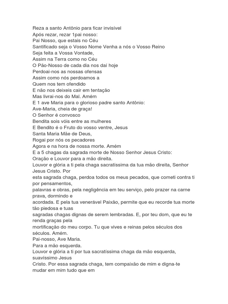 no Cu Santificado seja o Vosso Nome Venha a ns o Vosso Reino Seja feita a Vossa Vontade, Assim na Terra como no Cu O Po-Nosso de cada dia nos da hoje Perdoai-nos as nossas ofensas Assim como ns perdoamos a Quem nos tem ofendido E no nos deixeis cair em tentao Mas livrai-nos do Mal. Amm E 1 ave Maria para o glorioso padre santo Antnio: Ave-Maria, cheia de graa! O Senhor convosco Bendita sois vis entre as mulheres E Bendito o Fruto do vosso ventre, Jesus Santa Maria Me de Deus, Rogai por ns os pecadores Agora e na hora de nossa morte. Amm E a 5 chagas da sagrada morte de Nosso Senhor Jesus Cristo: Orao e Louvor para a mo direita. Louvor e glria a ti pela chaga sacratssima da tua mo direita, Senhor Jesus Cristo. Por esta sagrada chaga, perdoa todos os meus pecados, que cometi contra ti por pensamentos, palavras e obras, pela negligncia em teu servio, pelo prazer na carne prava, dormindo e acordada. E pela tua venervel Paixo, permite que eu recorde tua morte to piedosa e tuas sagradas chagas dignas de serem lembradas. E, por teu dom, que eu te renda graas pela mortificao do meu corpo. Tu que vives e reinas pelos sculos dos sculos. Amm. Pai-nosso, Ave Maria. Para a mo esquerda. Louvor e glria a ti por tua sacratssima chaga da mo esquerda, suavssimo Jesus Cristo. Por essa sagrada chaga, tem compaixo de mim e digna-te mudar em mim tudo que em