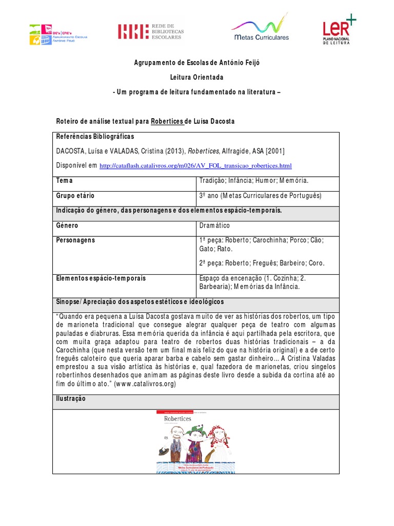 Roteiro de anlise textual para Robertices de Lusa Dacosta Referncias Bibliogrficas DACOSTA, Lusa e VALADAS, Cristina (2013), Robertices, Alfragide, ASA [2001] Disponvel em http://cataflash.catalivros.org/m026/AV_FOL_transicao_robertices.html Tema Grupo etrio Tradio; Infncia; Humor; Memria. 3 ano (Metas Curriculares de Portugus)