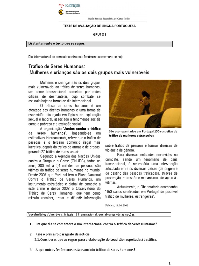8. O título da notícia refere-se a “mulheres e crianças”. Em tua opinião, o desenvolvimento da notícia dá o mesmo relevo a estes dois grupos? Justifica a tua resposta.