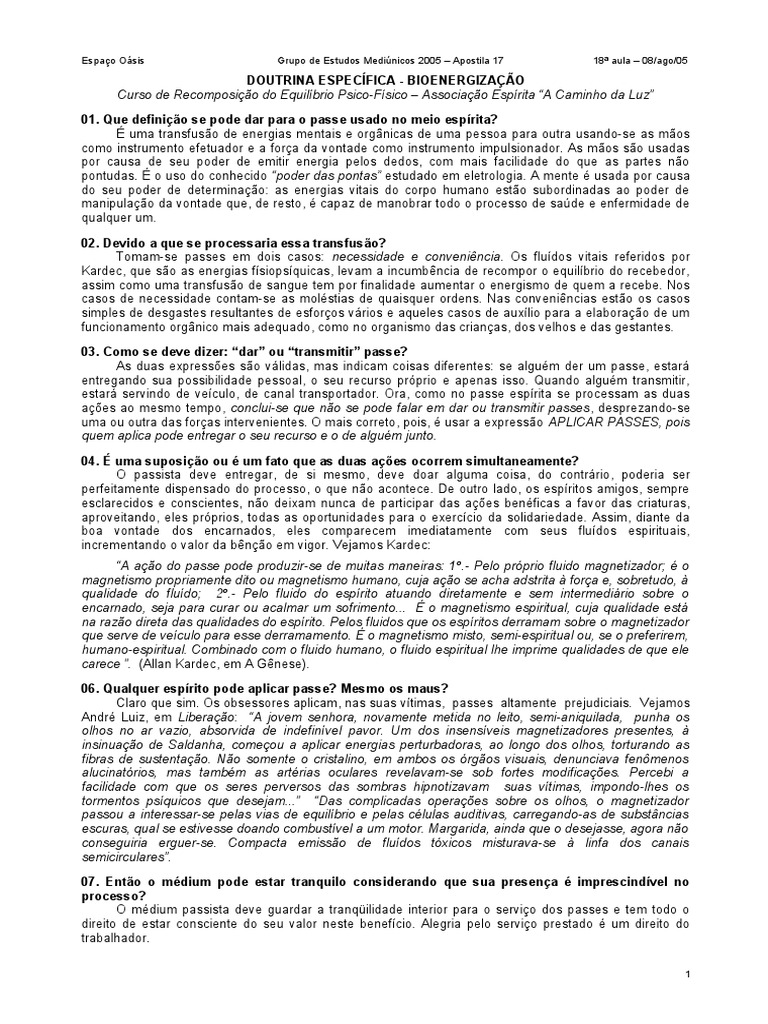 Espao Osis Grupo de Estudos Medinicos 2005 Apostila 17 18 aula 08/ao/05