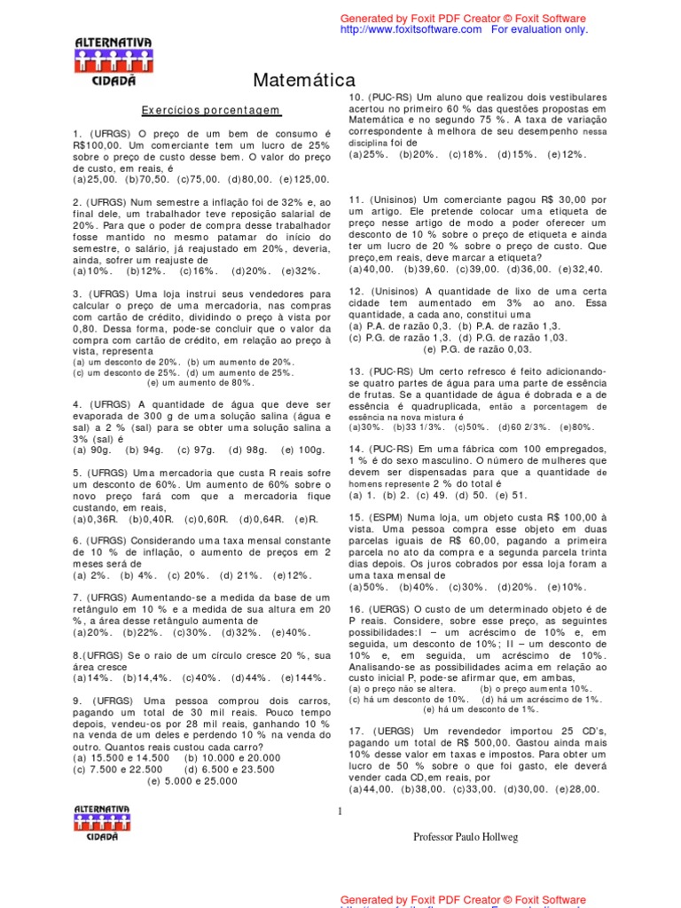 2. (UFRGS) Num semestre a inflação foi de 32% e, ao 11. (Unisinos) Um comerciante pagou R$ 30,00 por