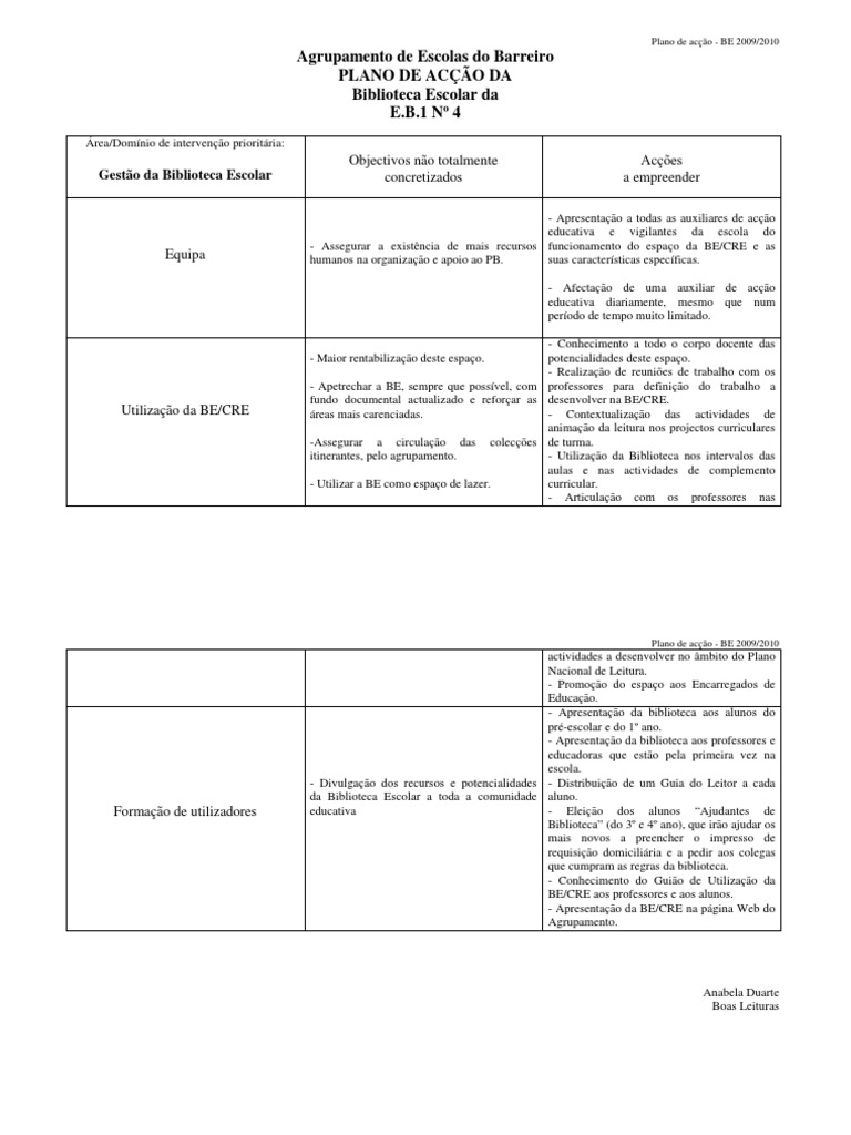 Agrupamento de Escolas do Barreiro PLANO DE ACÇÃO DA Biblioteca Escolar da E.B.1 Nº 4