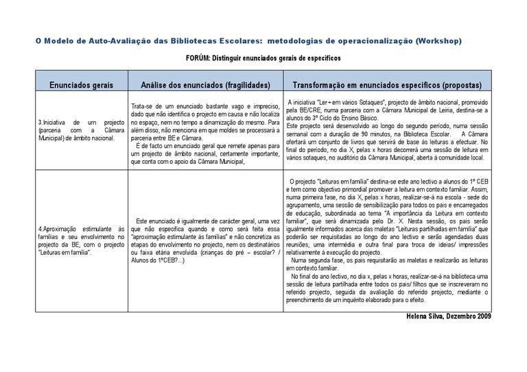 Enunciados gerais Análise dos enunciados (fragilidades) Transformação em enunciados específicos (propostas)