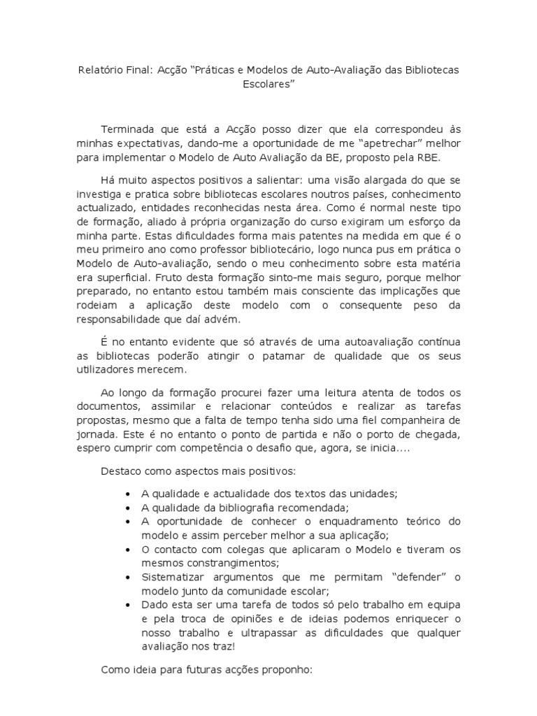 Relatório Final: Acção “Práticas e Modelos de Auto-Avaliação das Bibliotecas