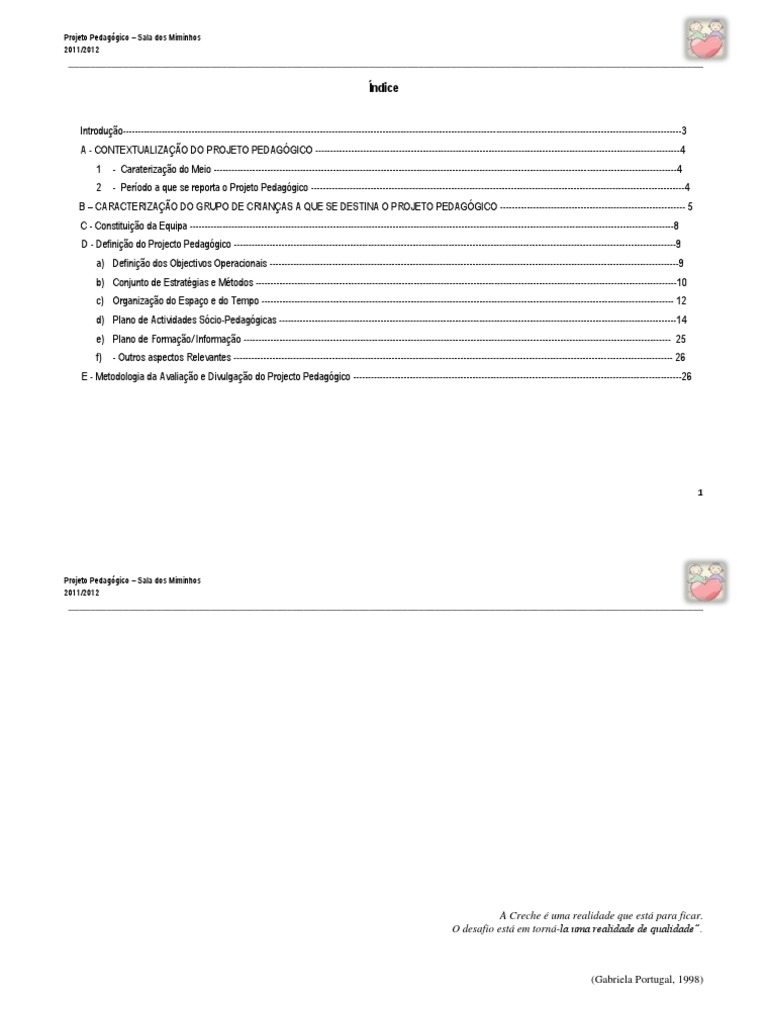 Adaptar-se progressivamente à rotina Comemorar algumas épocas festivas em conjunto com a instituição. músicas e lengalengas Adquirir hábitos de alimentação e higiene. Escutar histórias. Pronunciar palavras simples Criar momentos de brincadeira.Projeto Pedagógico – Sala dos Miminhos 2011/2012 ____________________________________________________________________________________________________________________ D . Meter um brinquedo ou livro na boca Desenvolver a autonomia e a socialização. Identificar alguns sons Incentivar a participação das famílias no processo educativo.Definição do Projecto Pedagógico a) Definição dos Objectivos Operacionais Objectivos Operacionais Indicadores de Avaliação Promover a aprendizagem através do seu corpo e todos os seus sentidos Olhar para a cara do adulto Promover o desenvolvimento da linguagem e enriquecimento do Brincar com as suas mãos vocabulário. afectividade e aprendizagem. Manifestar sentimentos e emoções Realizar ordens simples Participar progressivamente em festas 9 .