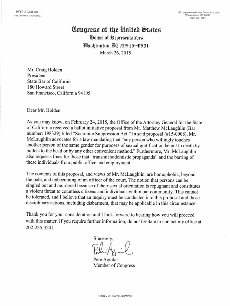 Rep. Pete Aguilar (CA-31) called on California State Bar President Craig Holden to conduct an inquiry into the homophobic ballot proposal submitted by attorney Matthew McLaughlin, which woul…Description complète