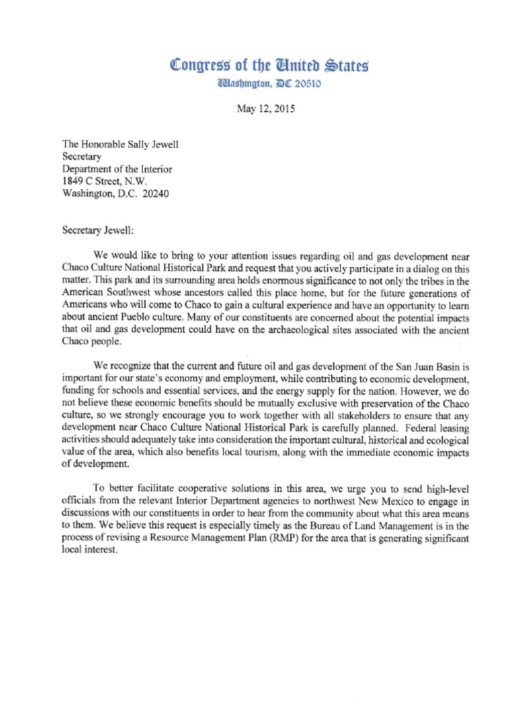 Udall Letter to Sec. Jewell on Chaco Canyon