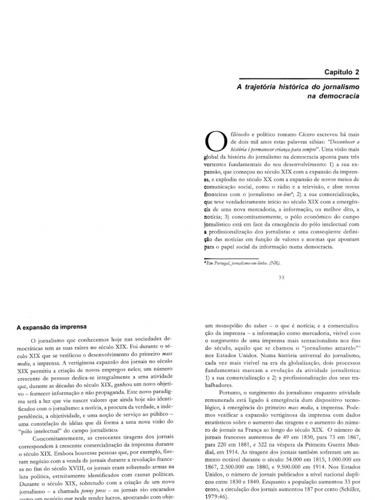 filósofo e político romano Cícero escreveu há mais de dois mil anos estas palavras sábias: ''Desconhecer a história épermanecer criança para sempre''. Uma visão mais global da história do jornalismo na democracia aponta para três vertentes fundamentais do seu desenvolvimento: 1) a sua ex- pansão, que começou no século XIX com a expansão da impren- sa, e explodiu no século XX com a expansão de novos meios de comunicação social, como o rádio e a televisão, e abre novas fronteiras com o jornalismo on-line 4 ; 2) a sua comercialização, que teve verdadeiramente início no século XIX com a emergên- cia de uma nova mercadoria, a informação,. ou melhor dito, a notícia; 3) concomitantemente, o pólo econômico do campo jornalístico está em face da emergência do pólo intelectual com a profissionalização dos jornalistas e uma conseqüente defini- ção das notícias em função de valores e normas que apontam para o papel social da informação numa democracia.