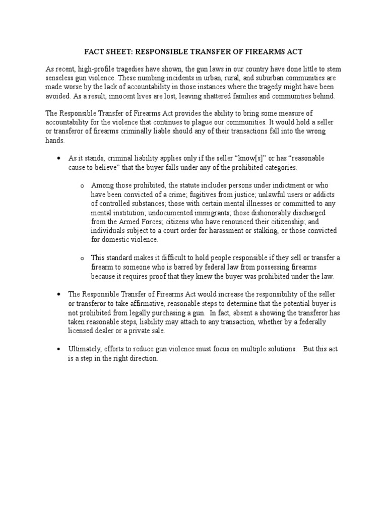 The Responsible Transfer of Firearms Act would hold people responsible if they sell or transfer a firearm to someone who is barred by federal law from possessing firearms.