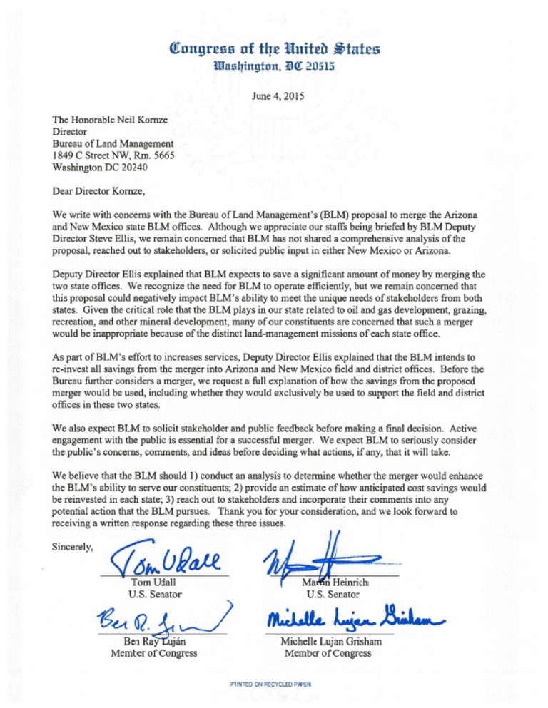 U.S. Sens. Tom Udall and Martin Heinrich, along with U.S. Reps. Ben Ray Luján and Michelle Lujan Grisham, sent a letter to BLM Director Neil Kornze expressing concerns that a merger would co…Description complète