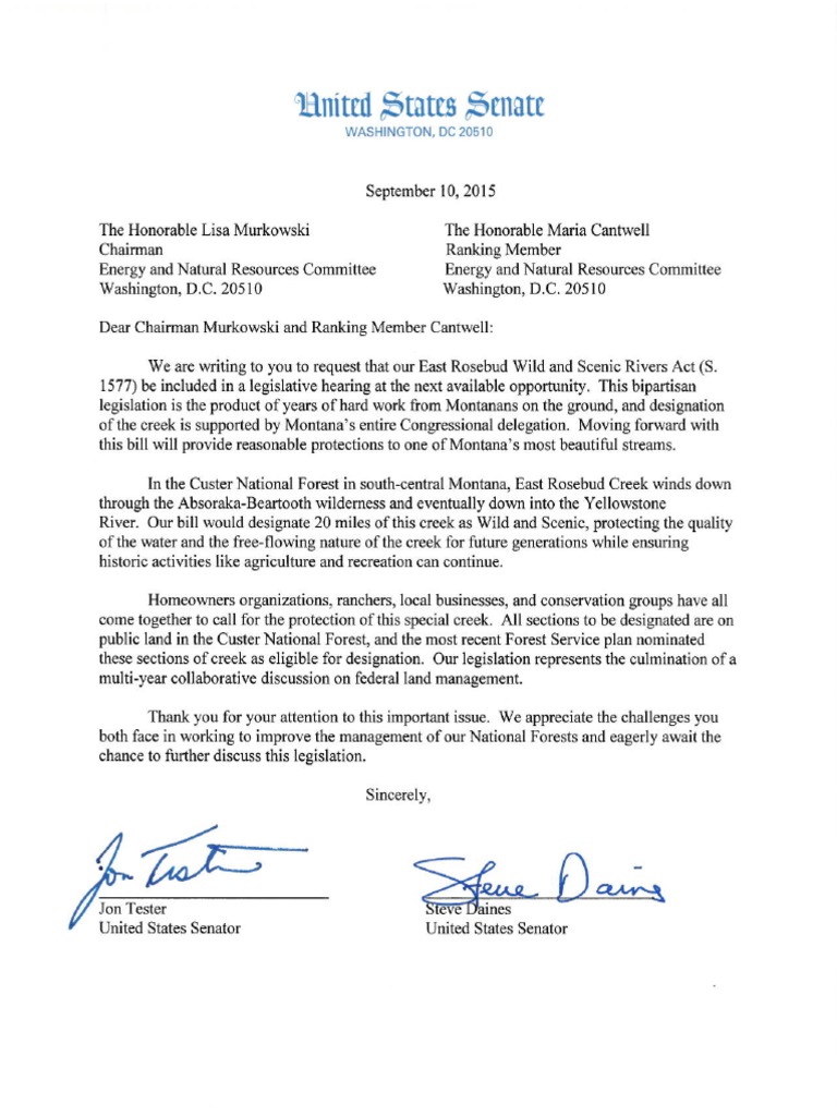 Tester and Daines’ letter to the Senate Energy and Natural Resources Committee