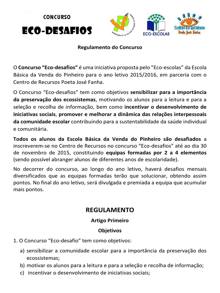 Todos os alunos da Escola Básica da Venda do Pinheiro são desafiados a inscreverem-se no Centro de Recursos no concurso “Eco-desafios” até ao dia 30 de novembro de 2015, constituindo equipas formadas por 2 a 4 elementos (sendo possível abranger alunos de diferentes anos de escolaridade).