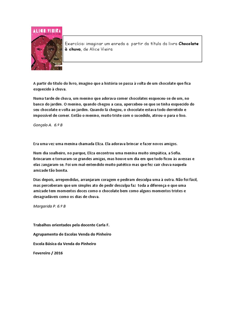 Exercício: imaginar um enredo a partir do título do livro Chocolate à chuva, de Alice Vieira