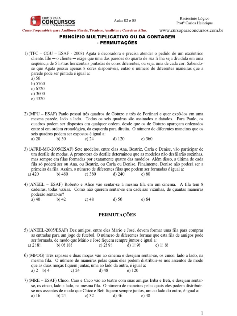 2) (MPU – ESAF) Paulo possui três quadros de Gotuzo e três de Portinari e quer expô-los em uma