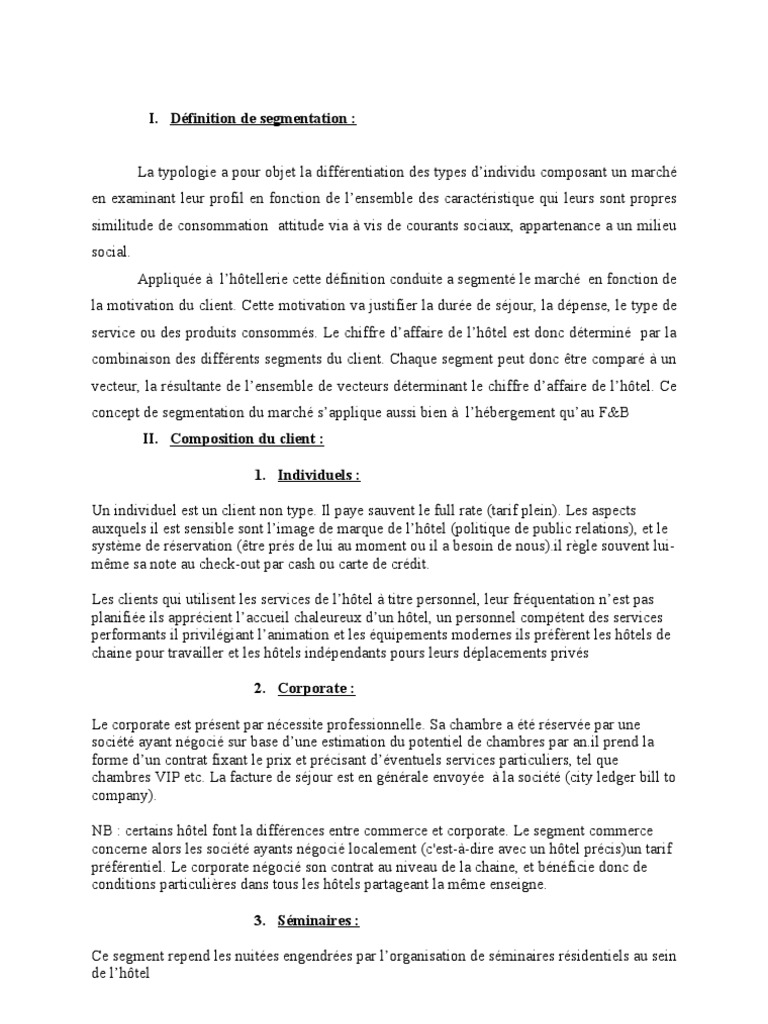 Appliquée à l’hôtellerie cette définition conduite a segmenté le marché en fonction de