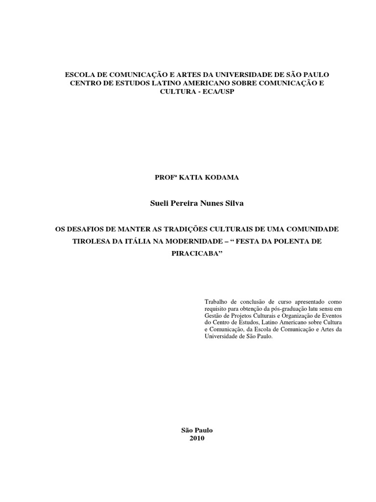 pela atenção paciência e principalmente pelo incentivo em percorrer os caminhos da pesquisa. pelo incentivo e compreensão.3 AGRADECIMENTOS Agradeço a Coordenação dos Cursos de Especialização do CELACC e sua quipe pela atenção.Chefe do Serviço de Cultura e Extensão Universitária. bem como sua importância na representação dos signos culturais da Comunidade. Um agradecimento especial ao Ivan Correr Coordenador dos Projetos Culturais da Comunidade Trentina de Santa Olímpia que relatou a história da origem dos Bairro de Santa Olímpia e Santana e sobre a Festa da Polenta. Denis de Oliveira pelas aulas maravilhosas que descortinou o universo teórico da Cultura de forma dinâmica e pelo empenho na Coordenação dos Cursos de Especialização do CELACC. em especial ao Estagiáio João da Secretaria. Dedico esse estudo ao meu amigo Joãodenir Furlan (in memorian) que pertencia a comunidade Tirolesa de Piracicaba. . e ao Prof. Profª Drª Katia Kodama. A Srª Elza –Presidente da Associação de Moradores de Santa Olímpia e aos moradores da comunidade pela atenção e interesse em levar ao conhecimento da sociedade a Cultura Trentina/Tiroleza de Piracicaba. por ser uma pessoa alegre e que sempre me incentivou a acreditar nos meus sonhos. Ao Presidente da Comissão de Cultura e Extensão Universitária Profº Drº Rubens Angulo Filho e a minha Coordenadora Maria de Fátima Durrer. Ao Presidente da Comissão de Cultura e Extensão Universitária Profº Drº Rubens Angulo Filho e a minha Coordenadora Maria de Fátima Durrer.Chefe do Serviço de Cultura e Extensão Universitária. A minha orientadora. pelo incentivo e compreensão.