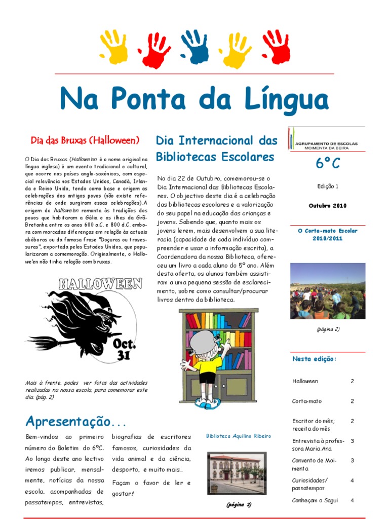Bem-vindos ao primeiro número do Boletim do 6ºC. Ao longo deste ano lectivo iremos publicar, mensal- mente, notícias da nossa escola, acompanhadas de passatempos, entrevistas,