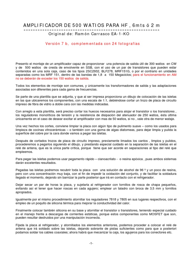 y de 500 watios de cresta de envolvente en SSB, con el uso de un par de transistores que pueden estar