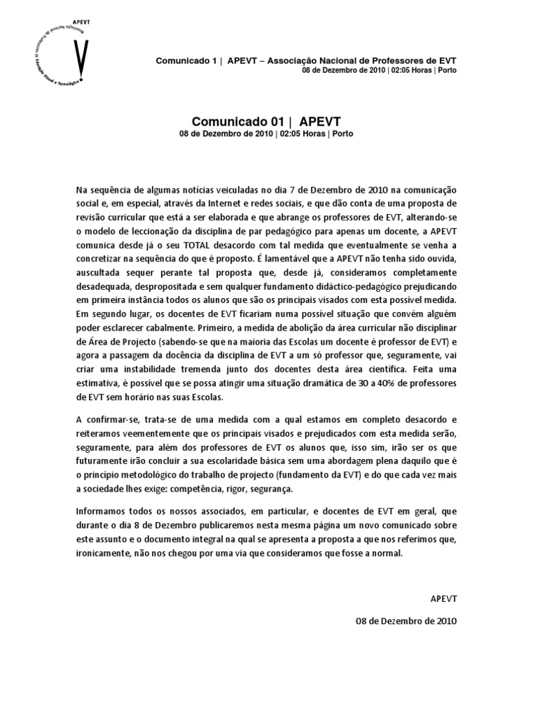 Comunicado 1 | APEVT – Associação Nacional de Professores de EVT