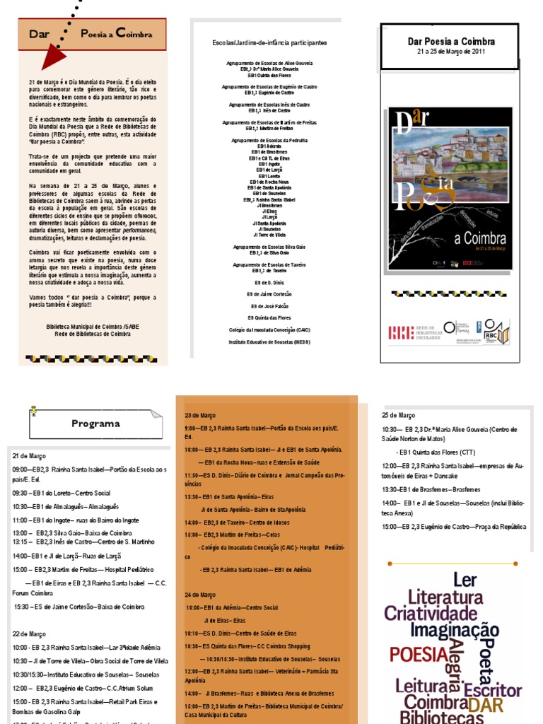 Na semana de 21 a 25 de Março, alunos e professores de algumas escolas da Rede de Bibliotecas de Coimbra saem à rua, abrindo as portas da escola à população em geral. São escolas de diferentes ciclos de ensino que se propõem oferecer, em diferentes locais públicos da cidade, poemas de autoria diversa, bem como apresentar performances , dramatizações, leituras e declamações de poesia.