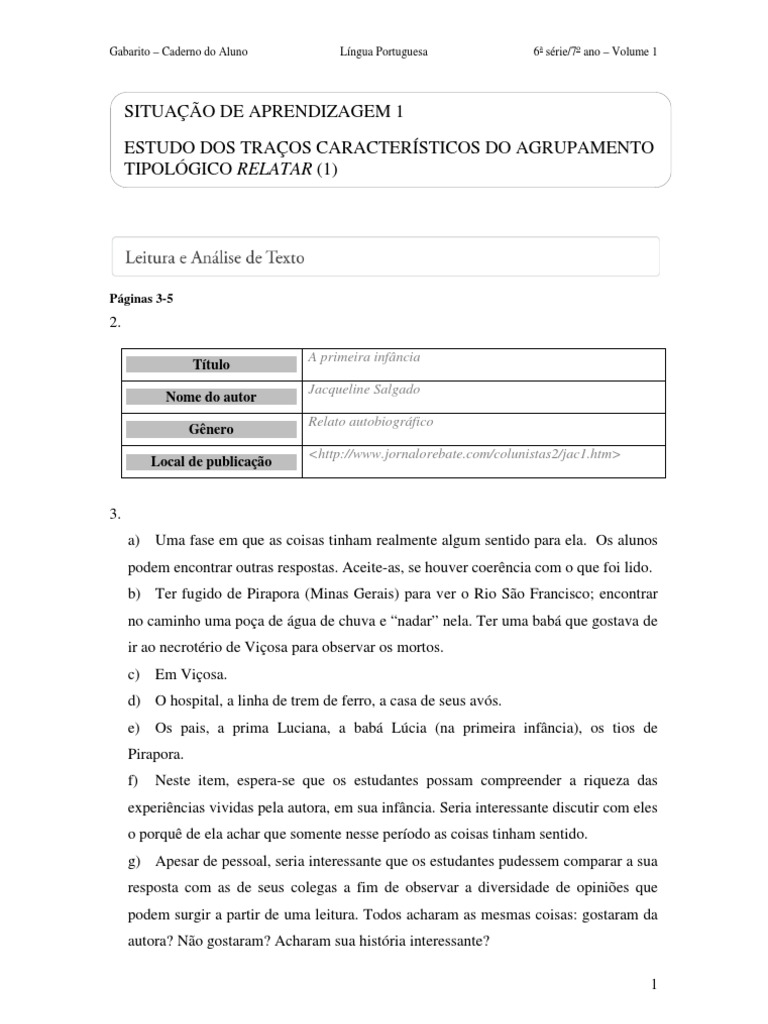 Gabarito – Caderno do Aluno Língua Portuguesa 6a série/7o ano – Volume 1